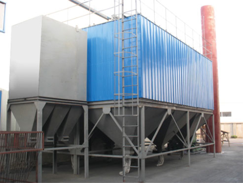 除塵器由灰斗、上箱體、中箱體、下箱體等部分組成,上、中、下箱體為分室結(jié)構(gòu)。工作時,含塵氣體由進(jìn)風(fēng)道進(jìn)入灰斗,粗塵料直接落入灰斗底部,細(xì)塵料隨氣流轉(zhuǎn)折向上進(jìn)入中、下箱體。粉塵積附在濾袋外表面,過濾后的氣體進(jìn)入上箱體至凈氣集合管——排風(fēng)道,經(jīng)排風(fēng)機(jī)排至大氣?;叶分械姆蹓m由輸送系統(tǒng)卸出。